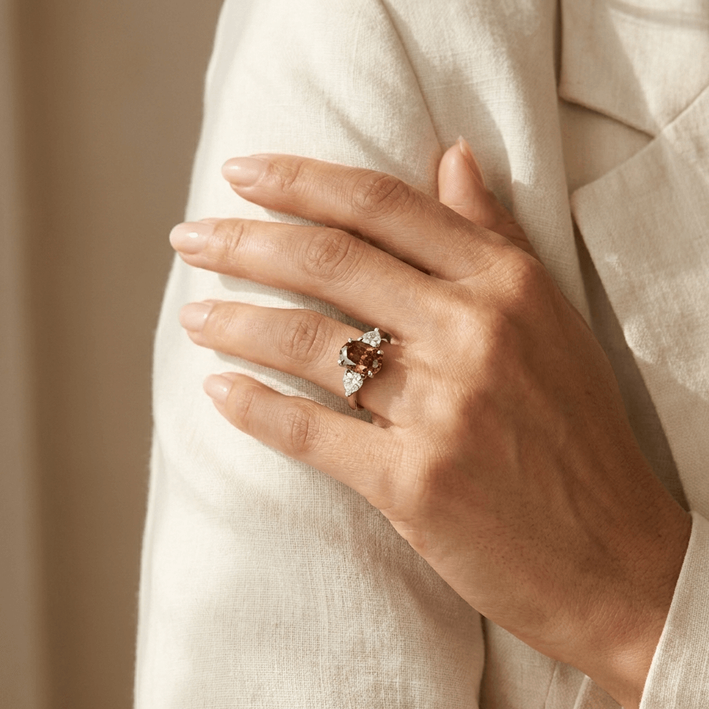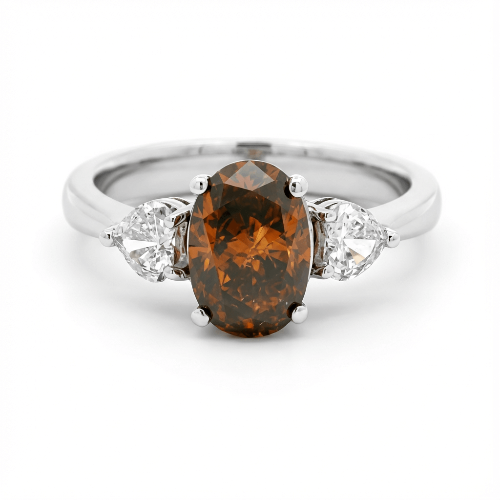 טבעת טרילוגיה "לבבות" | יהלום כתום-חום 1.51ct | זהב לבן 18K